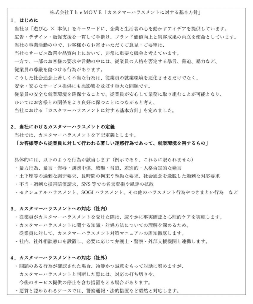 【カスタマーハラスメント防止に関する基本方針】株式会社TheMOVE「カスタマーハラスメントに対する基本方針」 2025年9月24日 okuland 当社では、従業員が安心して働ける環境を維持するとともに、 すべてのお客様に安全・安心なサービスを提供するため、 東京都の「カスタマーハラスメント防止対策推進事業」に基づき、 2025年9月24日より、以下の基本方針を定めています。